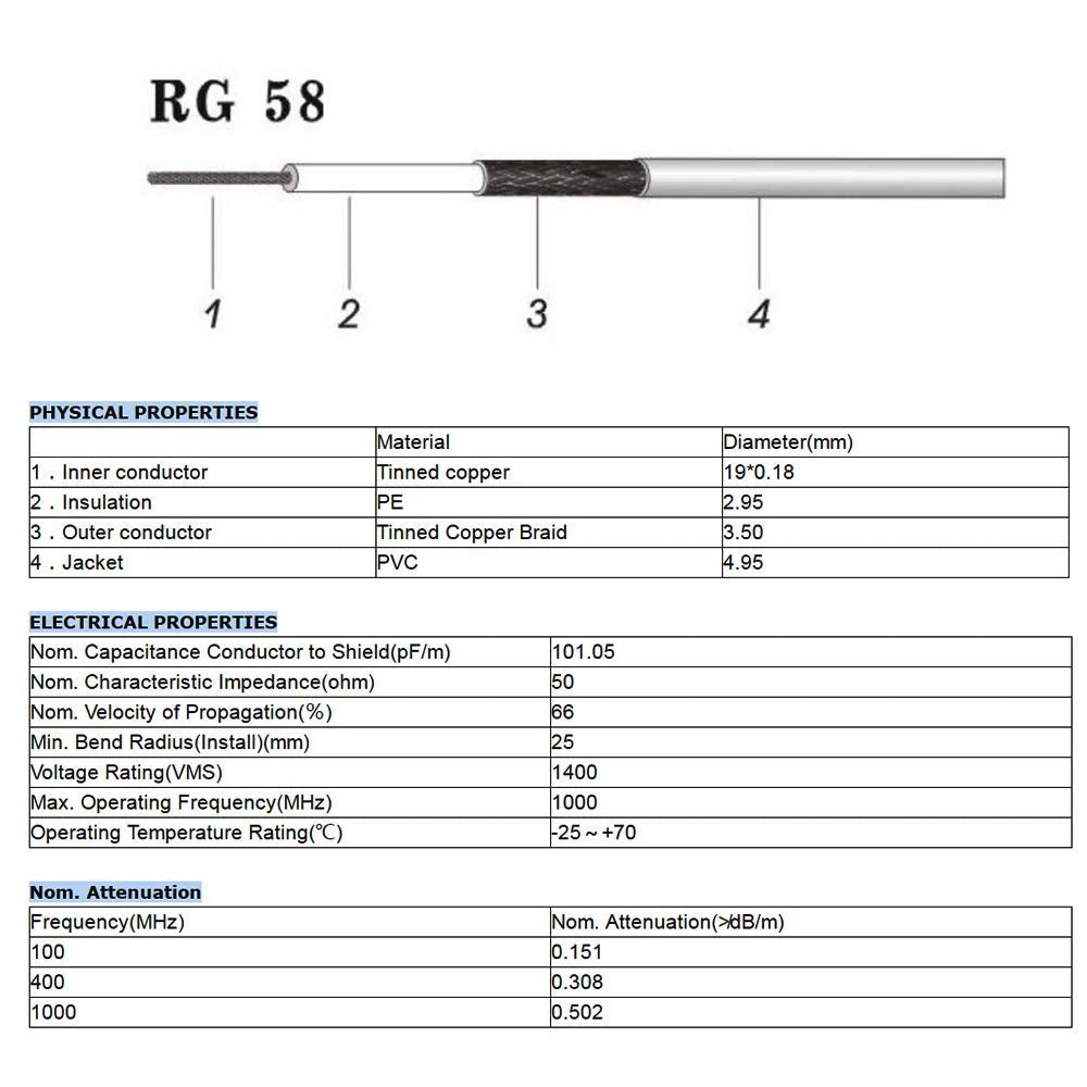 - BNC female to male cable type: RG58 coaxial cable, waterproof, good for a ham radio inside to the outside antenna | Impedance: 50 Ohm | Length: 3ft (100cm)