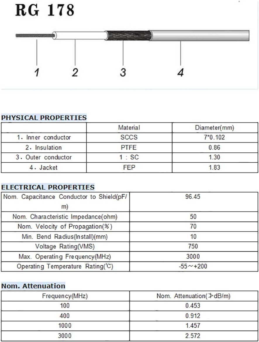 Impedance: 50 ohm coax cable | Cable Diameter(mm): 1.83 | Velocity of Propagation(%) 70 | Operating Temperature Rating(℃) -55~+200