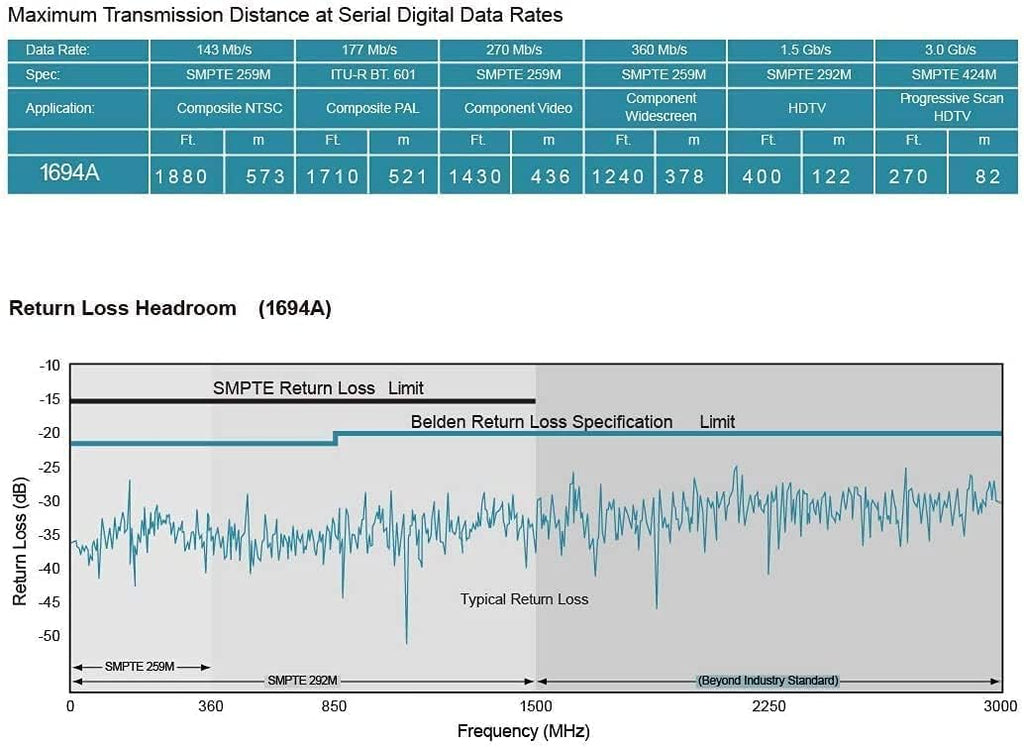 - Specifications: BNC male to BNC male (plug) | Connector: Gold plated | Impedance: 75 Ohm | Cable Type: Belden 1694A;18 AWG|Standard Definition SD-SDI (270 Mbps, ST 259) HD standard HD-SDI (1.483 Gbps, ST 292)3G-SDI (2.97 Gbps, ST 424) 6G-SDI (5.94 Gbps, ST 2081) 12G-SDI (11.88 Gbps, ST 2082)