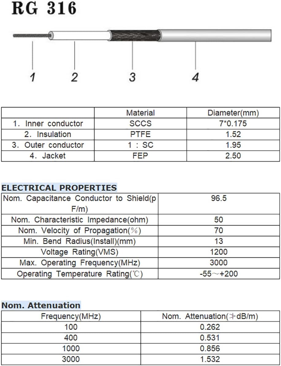 - Connector: SMA Male to BNC Male; material: copper | Cable type: RG316 jumper cable; Length: 6inch/15cm; Impedance: 50 Ohm;
