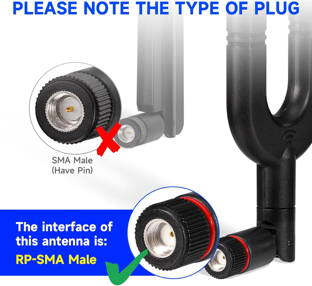 • Dual Band WiFi antenna 2.4GHz 5.8GHz antenna ; Gain: 6dBi ; Antenna Connector: RP-SMA Male